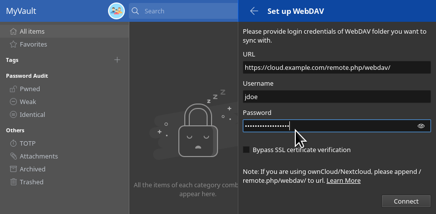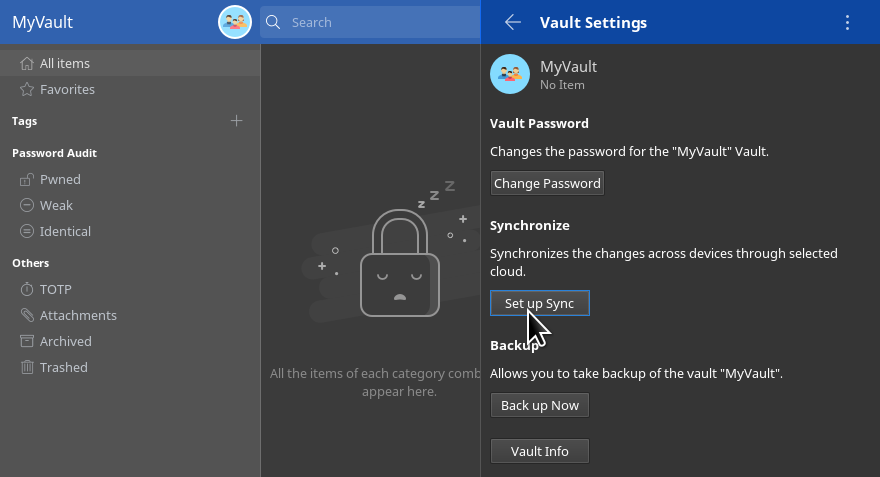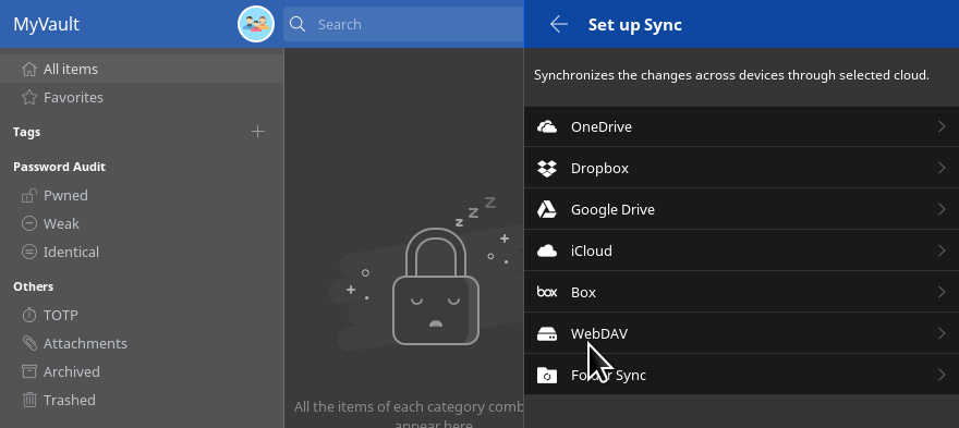 After setting your account password, you can set Enpass to synchronize through your Cloud server account. Sync creates an automatic back-up to the Cloud server, keeping passwords on all your devices up to date, and makes it possible to restore your private data in case a device is lost or stolen.