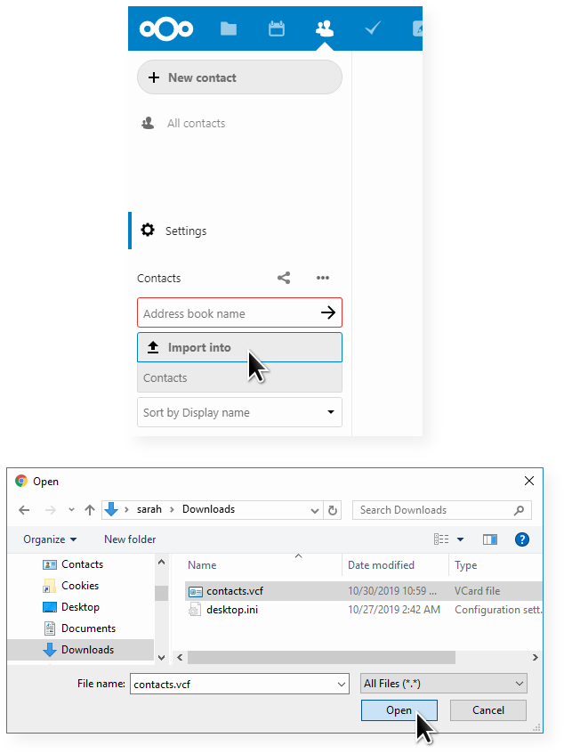 2. Click on Import into and select a local vCard (*.vcf) file.