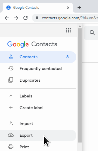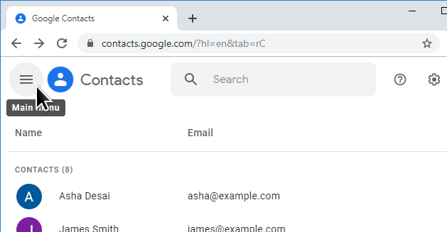 1. Sign in to your Google account, go to Google Contacts, and open the Main Menu (top left of the page).