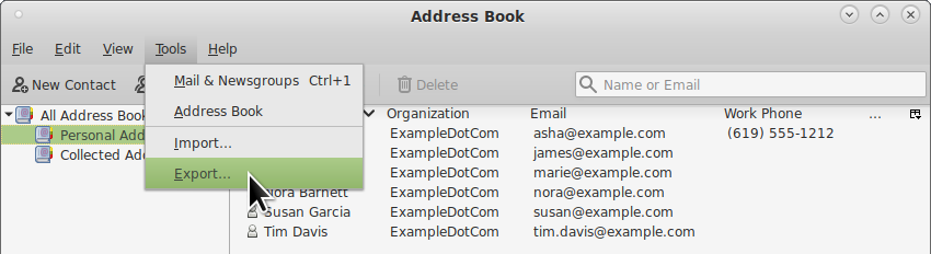 2. From the Address Book Tools menu, choose Export….